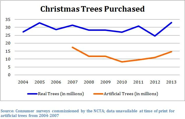 Even though they generated more revenue than real trees, artificial trees have yet to reach their pre-recession sales levels. Data provided by the NCTA, indicated that in 2013 there were 14.7 million artificial trees purchased, down from the 17.4 million purchased in 2007.